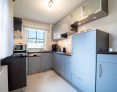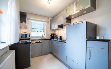 Die angrenzende geräumige Küche mit Markengeräten lädt zum