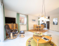 sowie ein Essplatz mit vier Stühlen. Der ganze Raum ist mit
