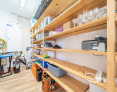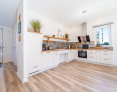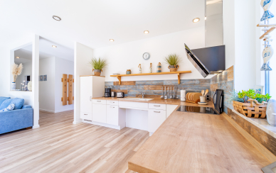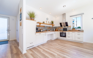 Die maßgeschneiderte Einbauküche ist ein Hingucker und lässt keine Wünsche offen. Die Arbeitsplatte wurde aus hochwertige Naturmaterialien hergestellt . Der angrenzende große Esstisch mit Platz für mehrere Personen ist ebenfalls aus dem gleichen schönen Holz gefertigt,