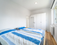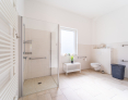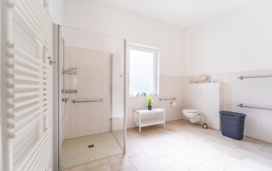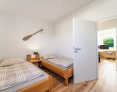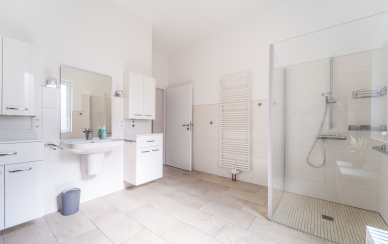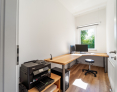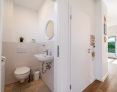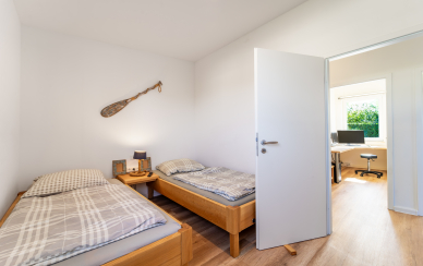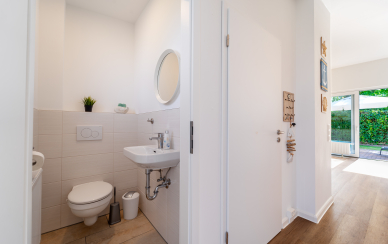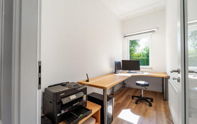 Von der lichtdurchfluteten Diele gehen ein Gäste-WC, ein Hauswirtschaftsraum, die beiden Schlafzimmer, ein Arbeitszimmer sowie das große Duschbad ab.