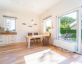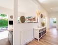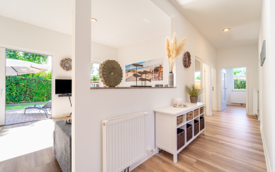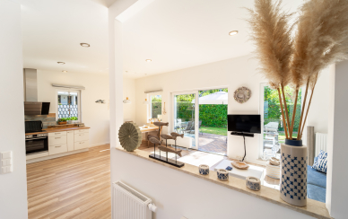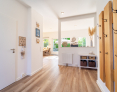 Der Raumteiler zwischen Flur und Wohn-Essbereich ist geschickt gefertigt und gibt einen offenen Blick in den dahinterliegenden Garten.