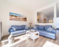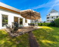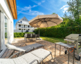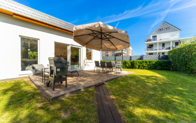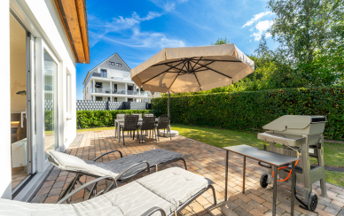 Durch die breiten Schiebetüren gelangen Sie auf die großzügig angelegte Terrasse. Diese ist u.a. auch für schöne Grillabende mit einem "Weber-Grill" ausgestattet. Die Tischgruppe mit Sonnenschirm und die Sonnenliegen laden zum gemütlichen Beisammensein ein.