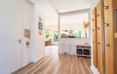 Durch die breite Hauseingangstür aus Aluminium betreten Sie den großzügigen und hellen Flurbereich.
