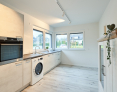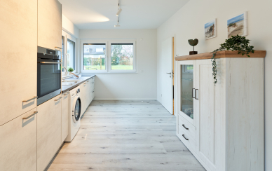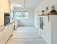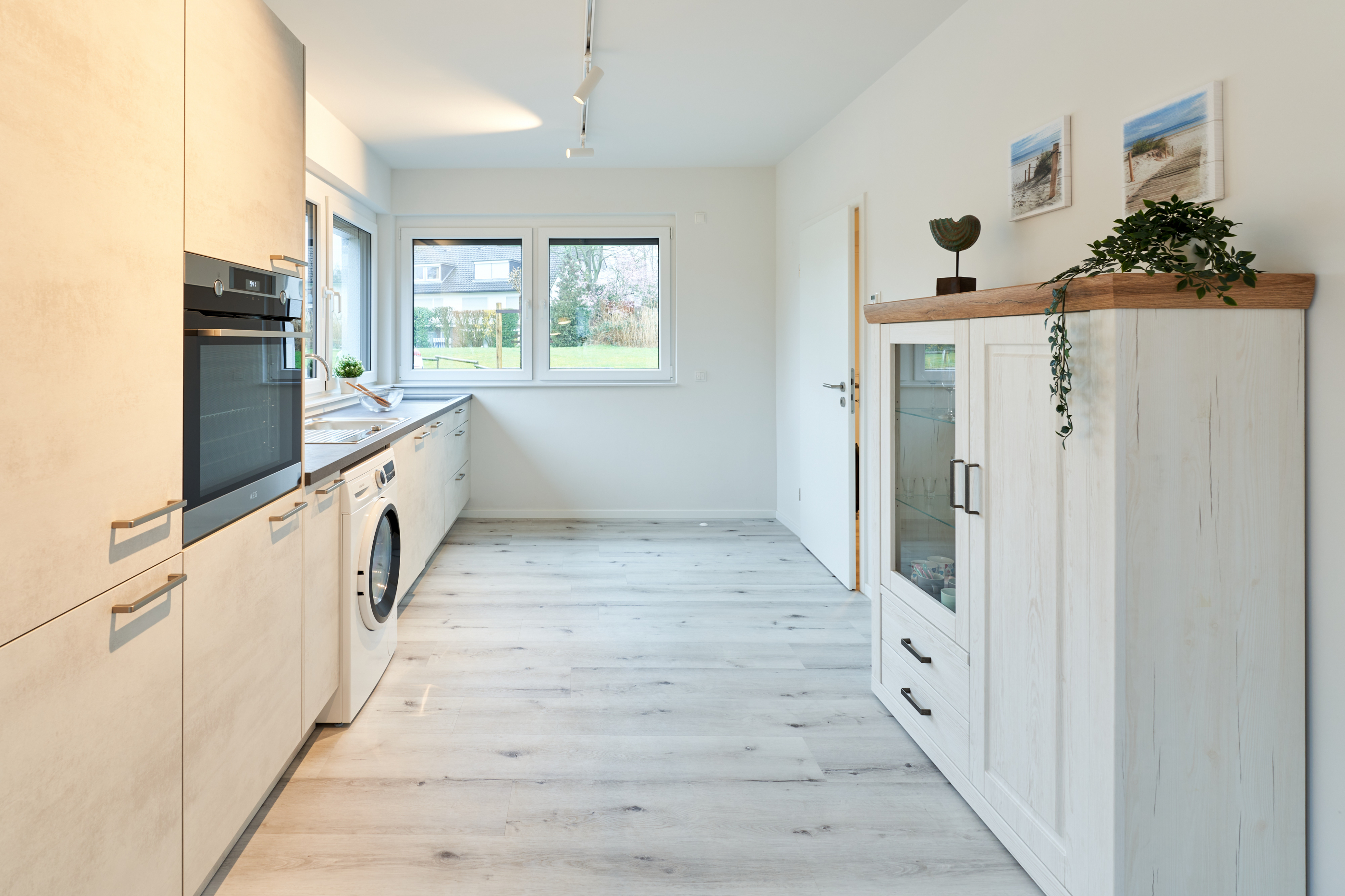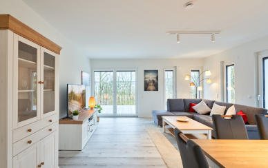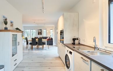Ein separater Wohnungseingang führt Sie in den hellen und geräumigen Flur der 3-Zimmer-Wohnung . Von hier gelangen Sie in den offenen Wohn -/ Essbereich mit großer Einbauküche. Die hohen Decken verleihen der Wohnung ein luftiges Wohnwertgefühl. Die Wohnlandschaft mit Blick ins Grüne lädt zum Verweilen ein. Durch die breiten Schiebetüren haben Sie Zutritt auf die 45 m2 große Terrasse in Süd-Ost-Lage. Am Tisch können Sie morgens im Sonnenschein Frühstücken und alle Mahlzeiten in der Natur geniessen.