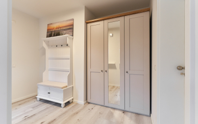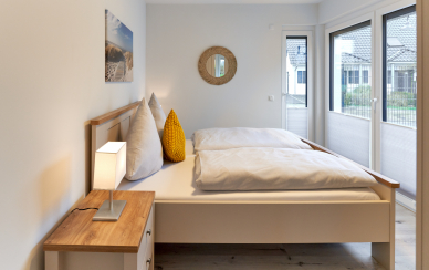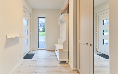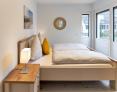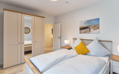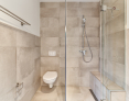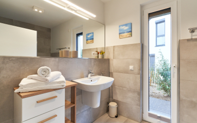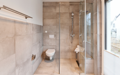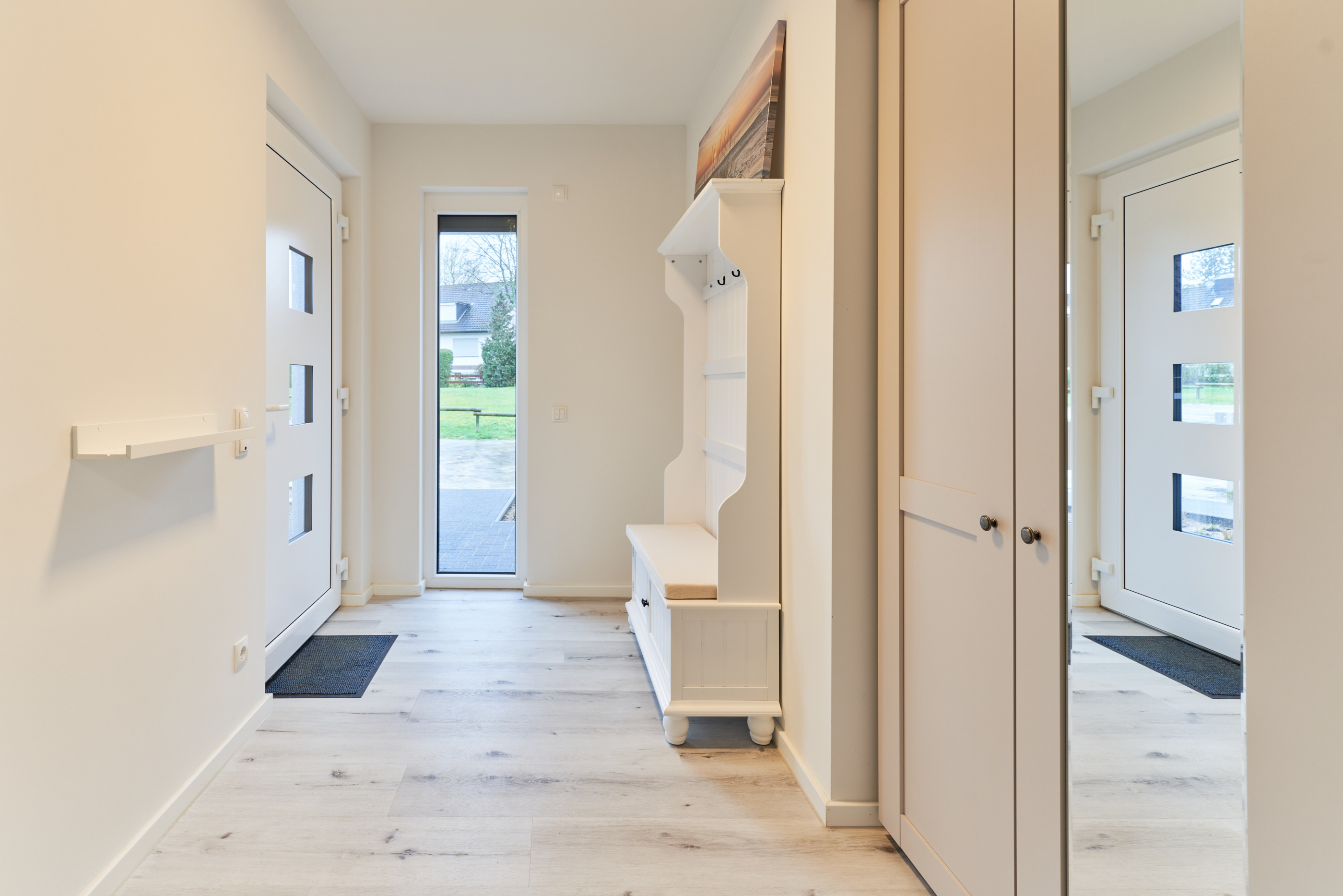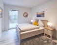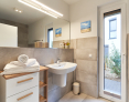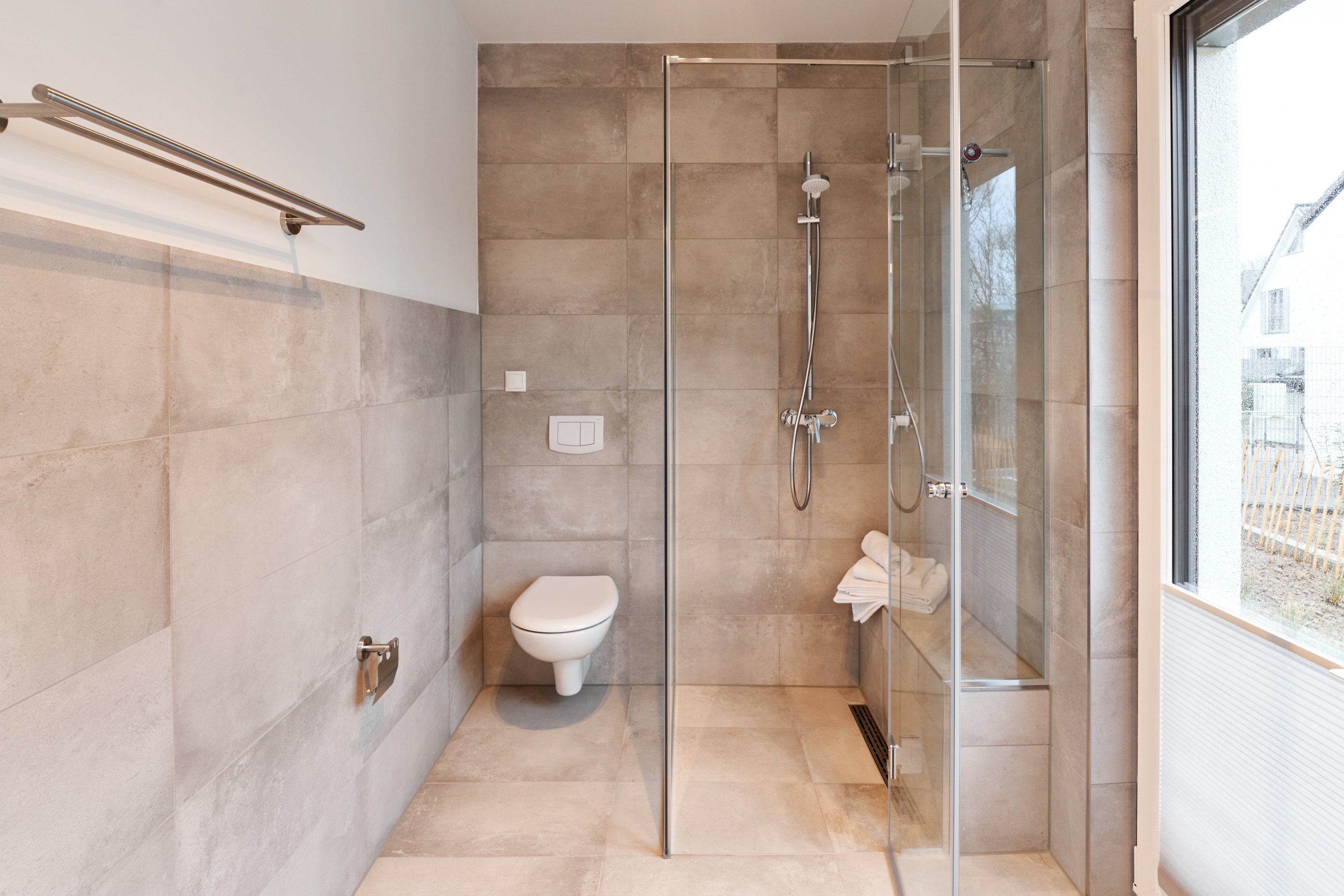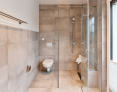 Vom Wohnzimmer abgehend gelangen Sie durch eine Tür in einen Zwischenflur. Von hier gehen die zwei Schlafzimmer und zwei Wohlfühl-Wellness-Duschbäder ab. Diese sind u.a. mit bodengleich Duschkabinen ausgestattet.