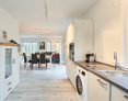 Hier können auch Sonnenliegen und ein Strandkorb aufgestellt werden. In der großzügig angelegten Einbauküche lassen sich Speisen und Mahlzeiten zubereiten.