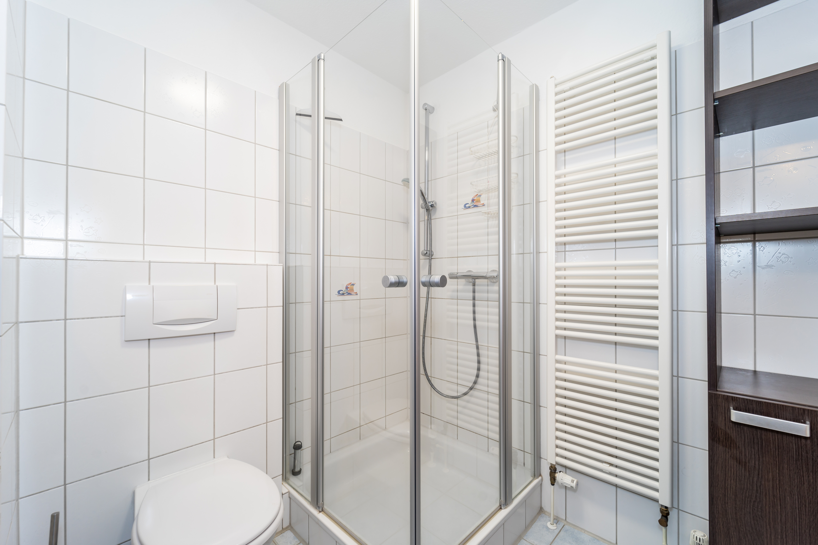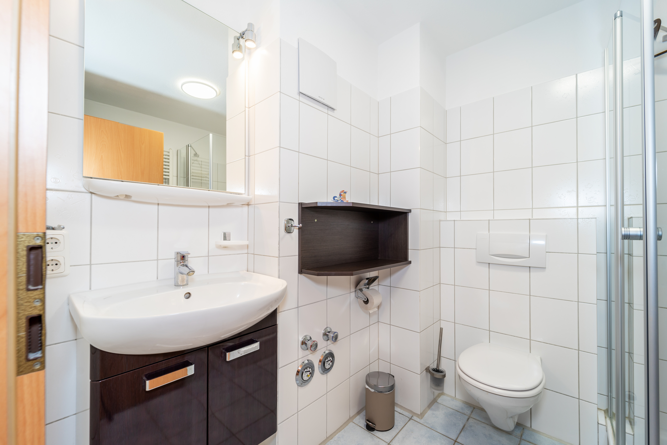 Das modern neuwertige Badezimmer ist mit einer komfortablen Dusche sowie einem Handtuchhalter Heizung sowie praktischem Unterschrank ausgestattet und bietet Ihnen alles für den täglichen Komfort.