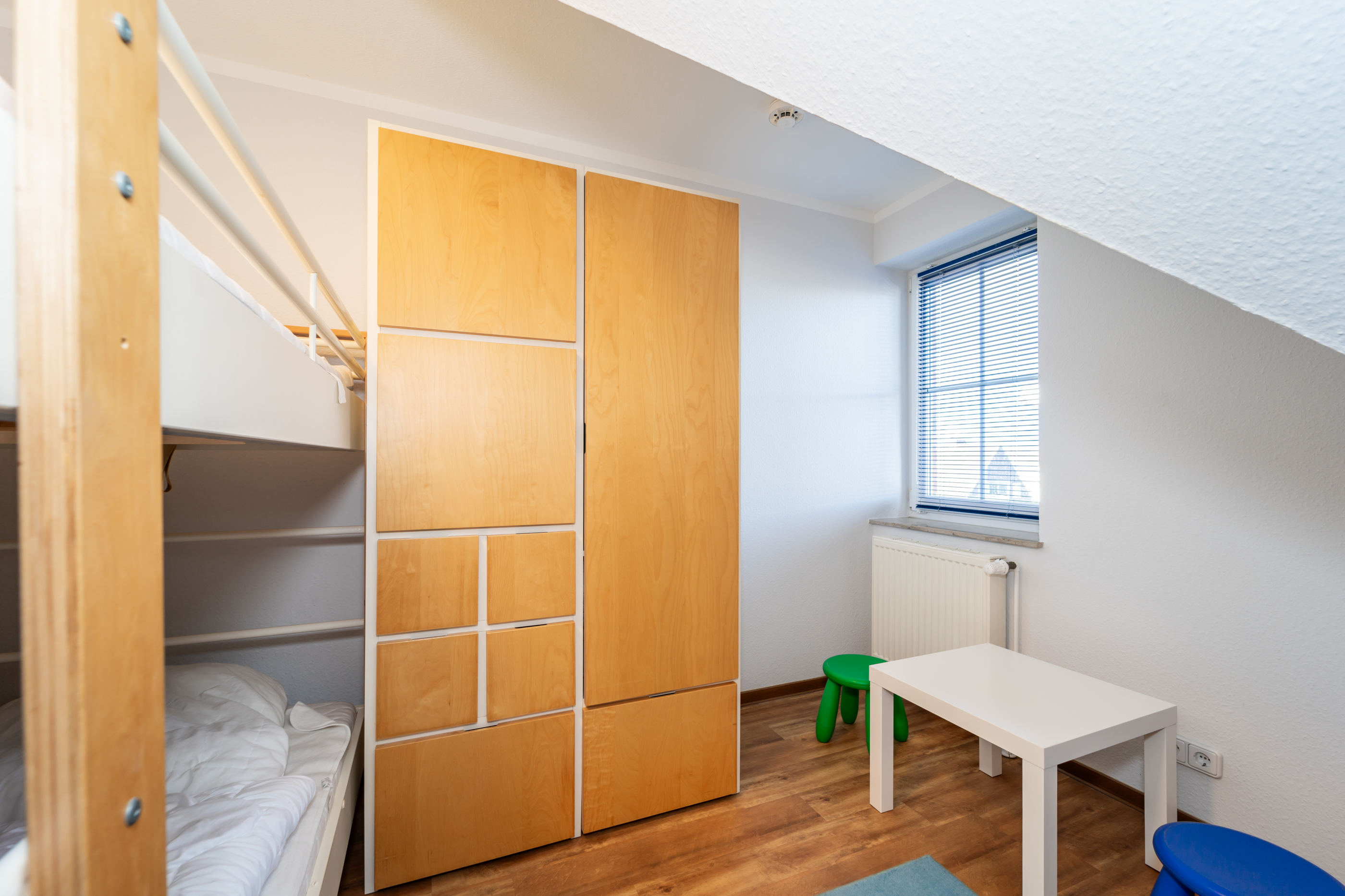 Vom Flur aus erreichen Sie außerdem das Kinderzimmer. Es verfügt über ein stabiles Etagenbett, einen praktischen Kleiderschrank mit reichlich Stauraum sowie einen kindgerechten Spieltisch mit zwei Hockern – perfekt für Spiel- und Bastelstunden.