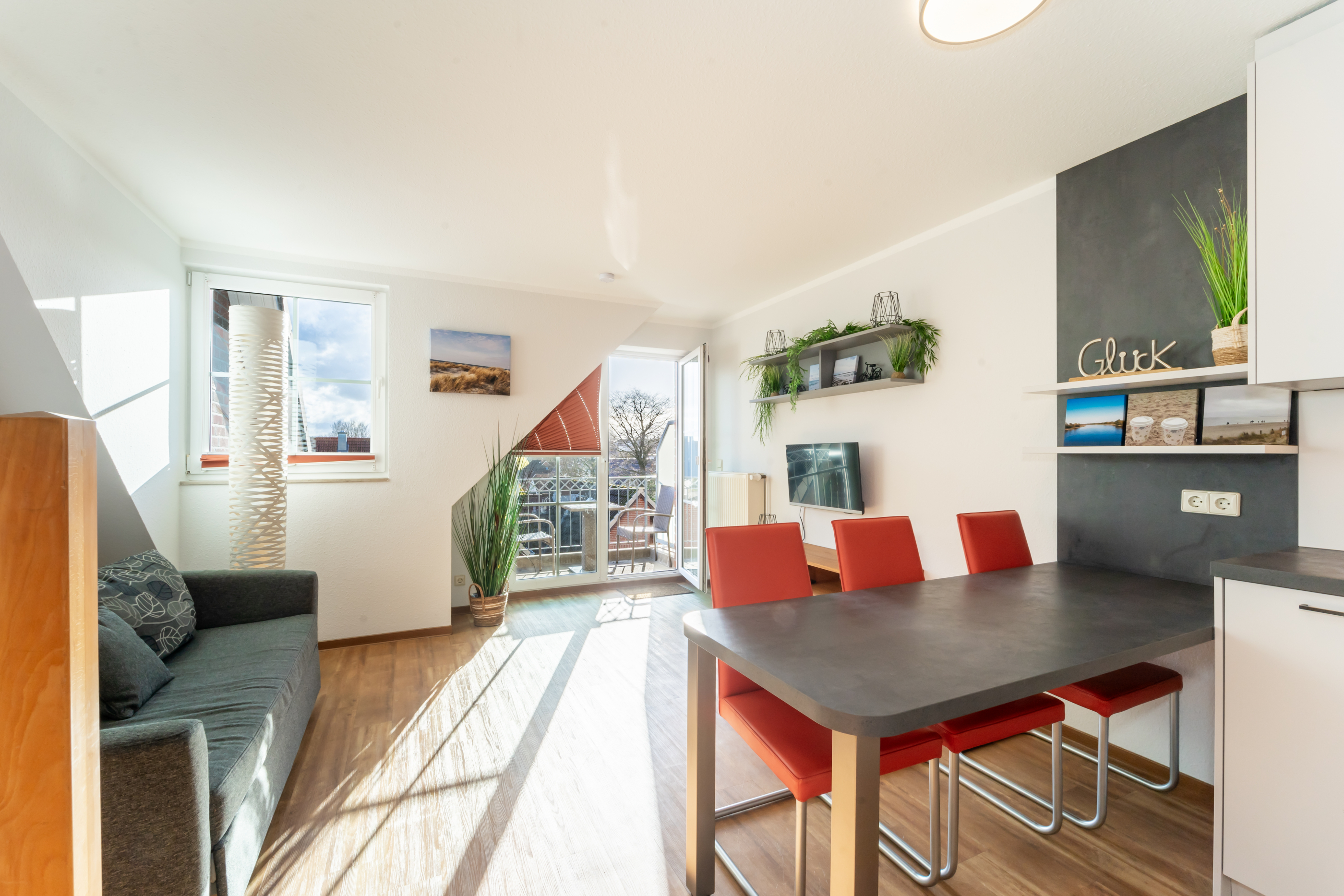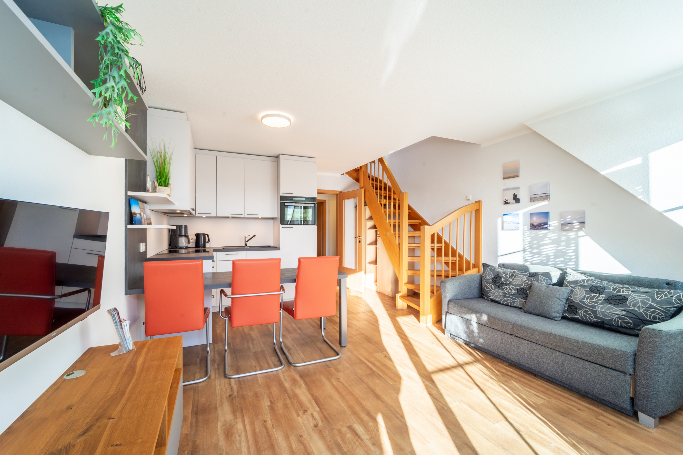 Hier erwartet Sie eine gemütliche Schlafcouch, die zusätzlichen Übernachtungskomfort bietet, sowie ein Esstisch mit 4 Stühlen für entspannte Abende. Ein Sideboard mit Fernseher rundet den Wohnbereich ab.