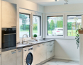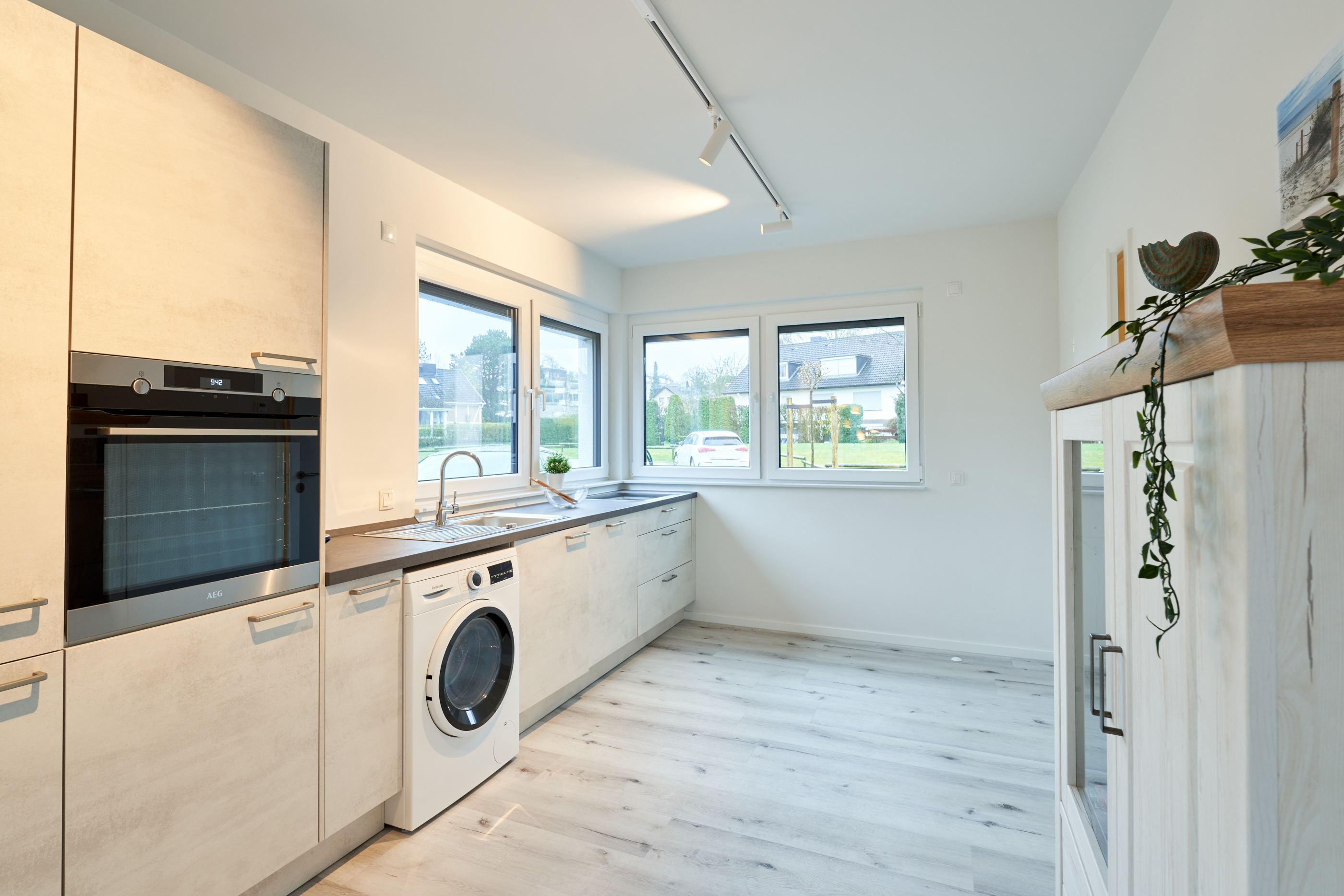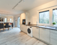 Die großzügige Einbauküche lässt keine Wünsche offen und ist mit modernen Küchengeräten ausgestattet. Das erste Schlafzimmer enthält einen offenen Duschbereich. In einem separaten angrenzenden Raum befindet sich die Toilette.