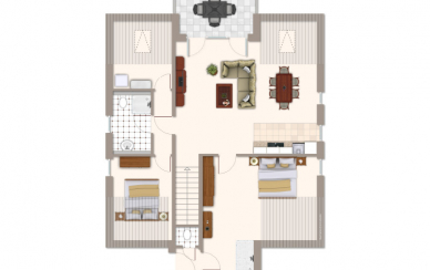 Eine breite Treppe führt Sie in die erste Etage und in den hellen gemütlichen Wohn- Essbereich.