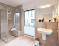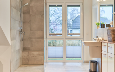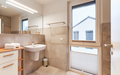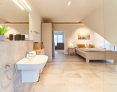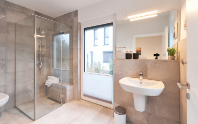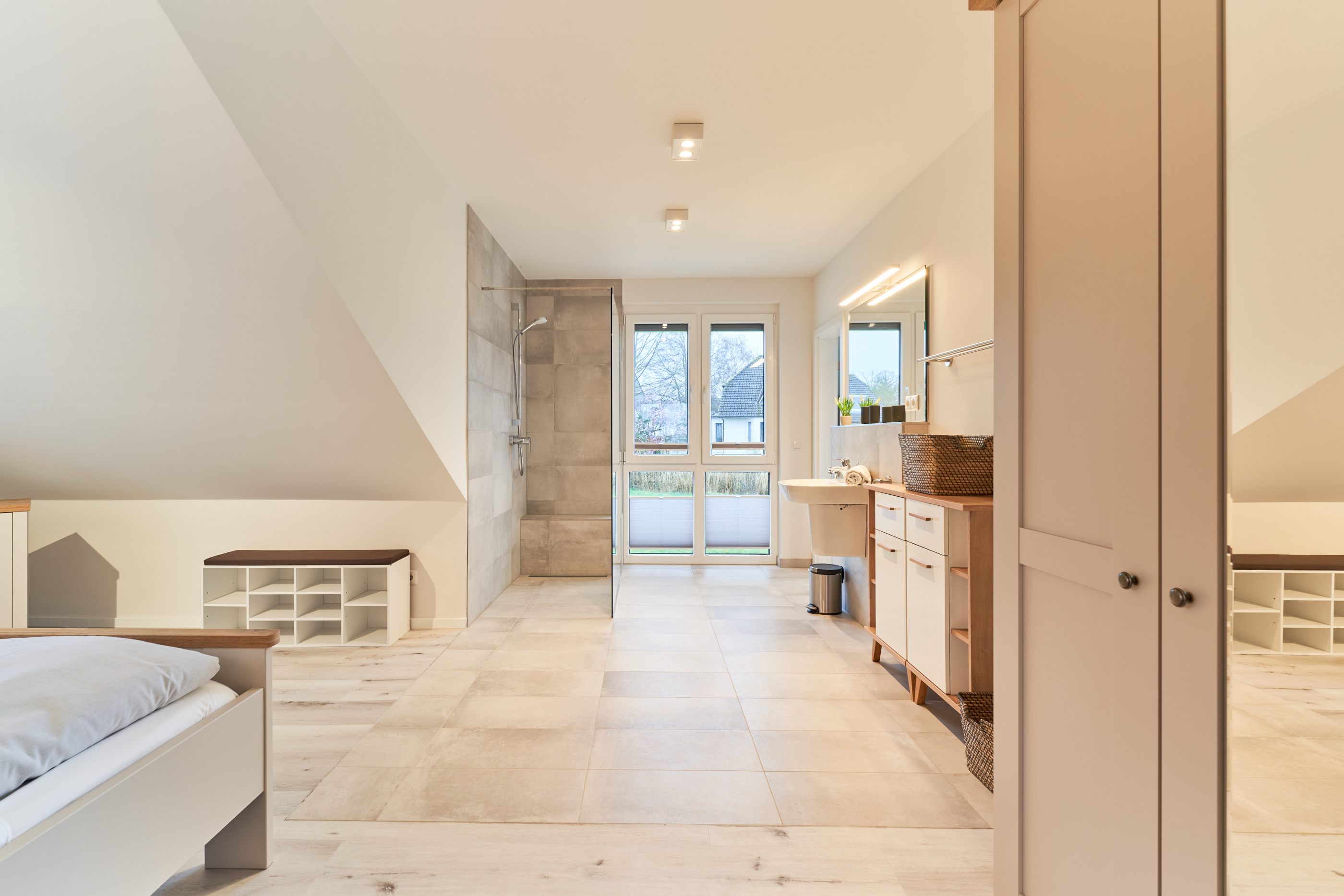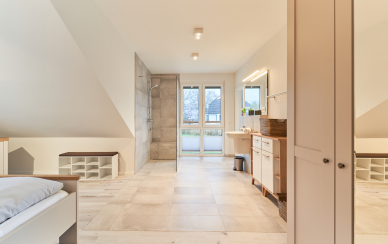 Durch einen Zwischenflur gelangen Sie in die zwei unterschiedlich gestalteten Schlafzimmer und zwei Wohlfühl-Duschbäder mit Tageslicht und u.a. bodengleichen Duschbereichen.