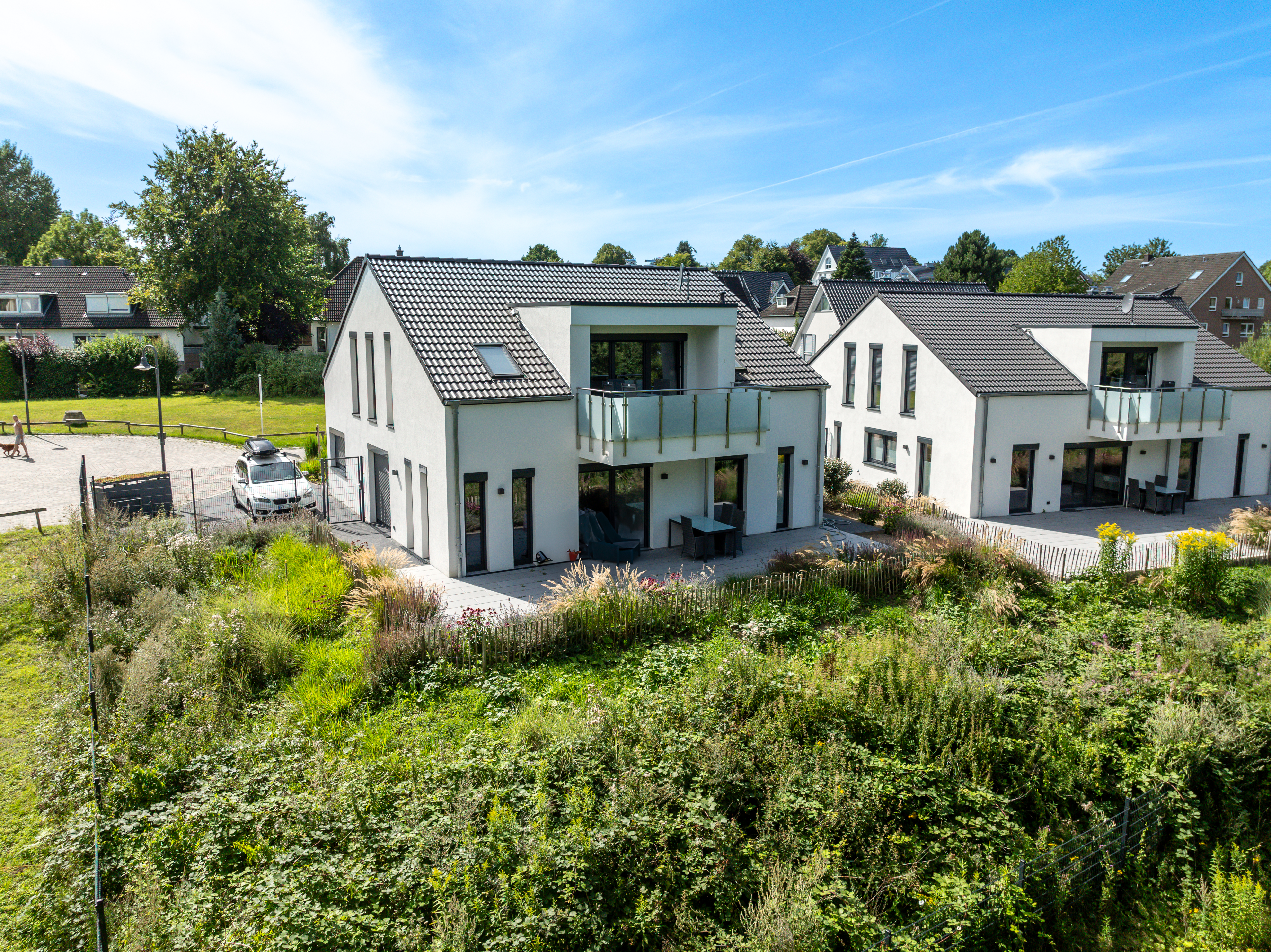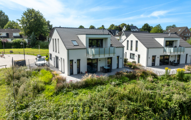 Die 104m 2 große 3-Zimmer-Wohnung im Erdgeschoss wird mit einer großzügigen Terrasse angeboten, die 111 m2 große 3-Zimmer-Wohnung befindet sich im Obergeschoss und verfügt über einen großen Balkon mit Blick ins Grüne.